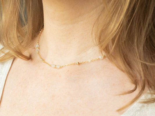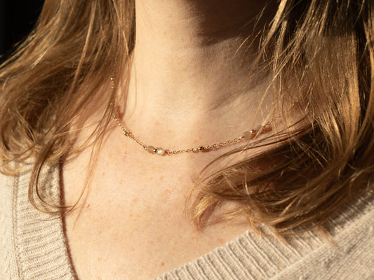 Une guirlande de douceur et de lumière autour de votre cou, pour agrémenter vos petits pulls et autres décolletés. Une finesse intemporelle qui séduit et que vous aurez toujours plaisir à porter.