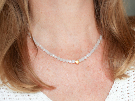 Eclat de douceur avec son petit coeur mat au centre, ce collier est une ode à la tendresse et à la beauté naturelle et simple des cristaux.