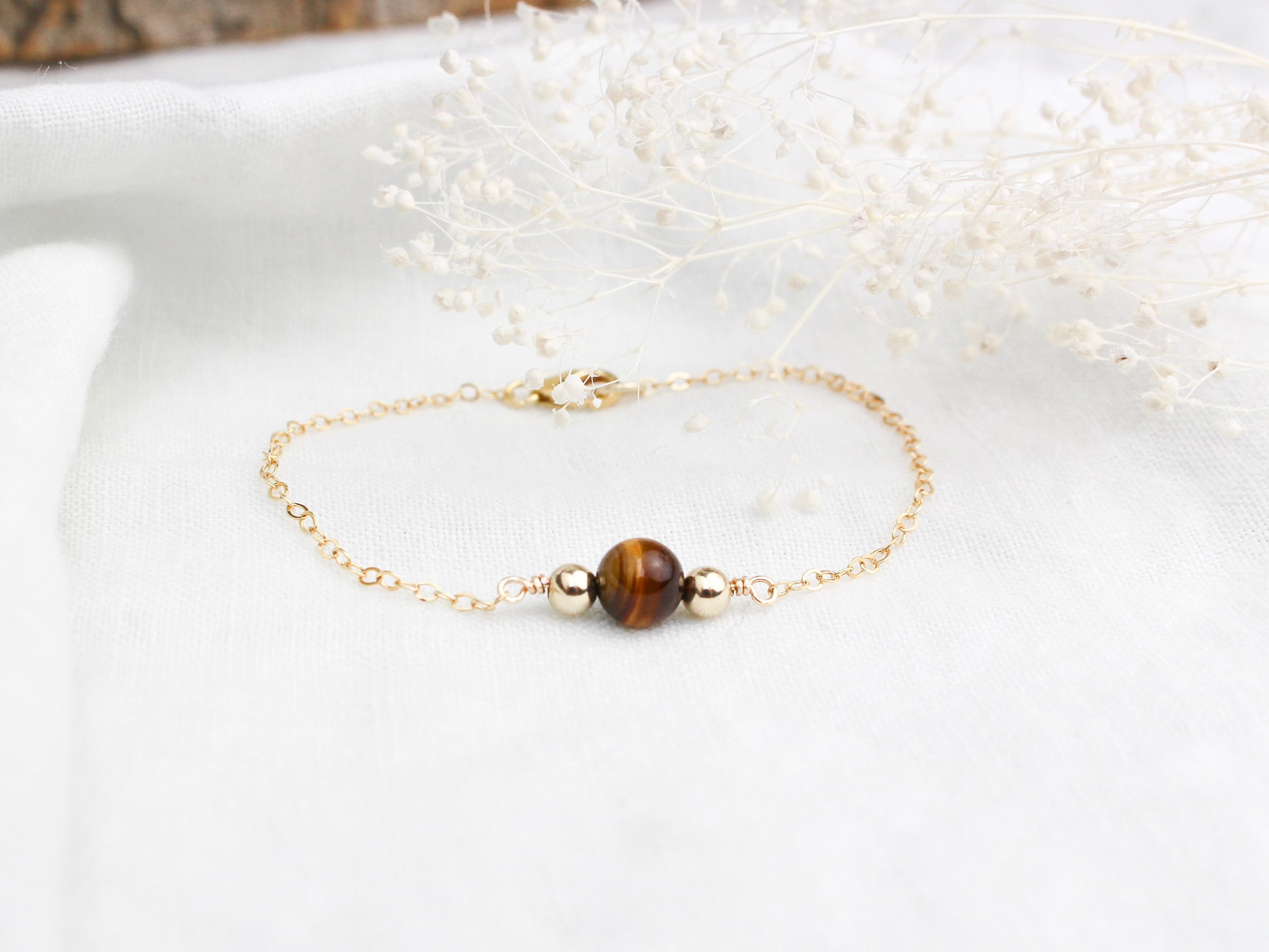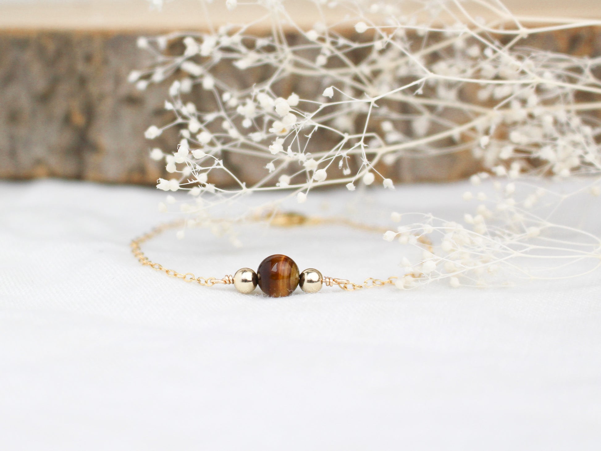 Matériel : perle ronde de 6 mm en oeil de tigre. Eléments en gold filled ou argent.