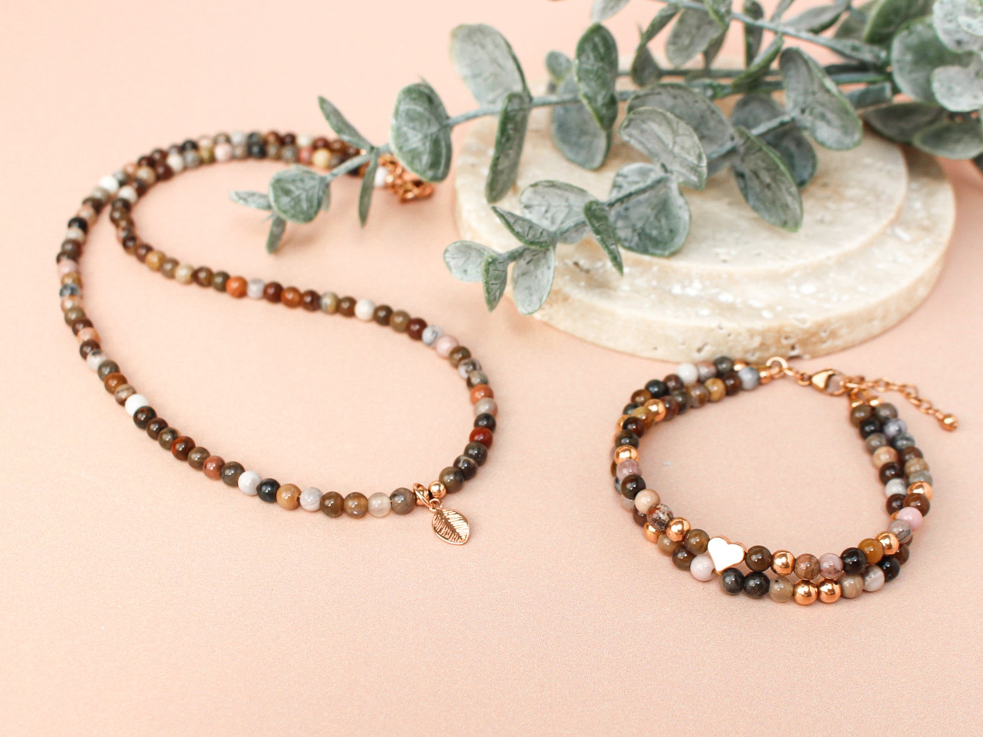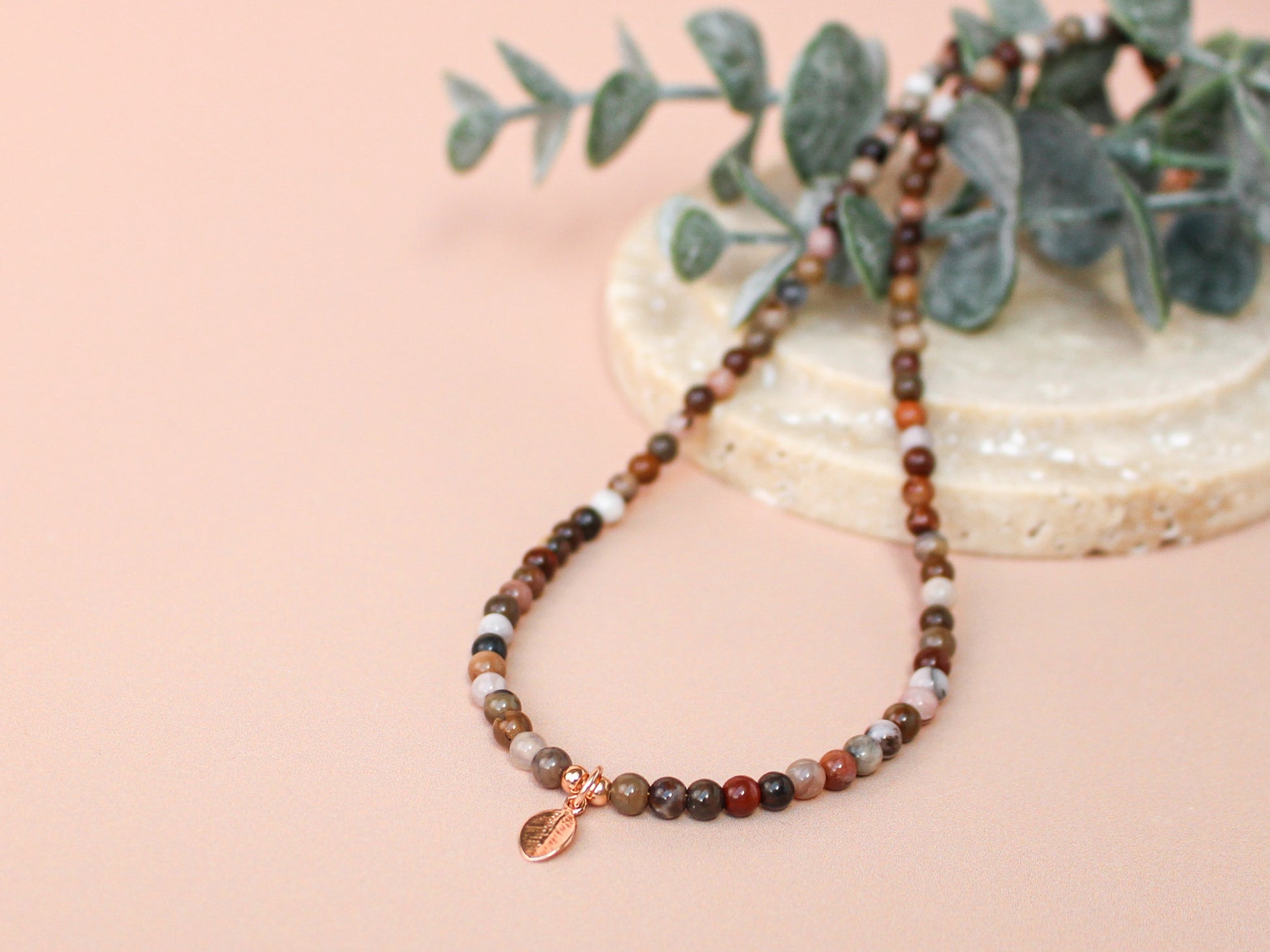 Matériel : perles rondes de bois fossilisé de 4 mm. Chaîne, fermoir et perles en rose gold filled. Disponible aussi en rose gold filled ou en argent.